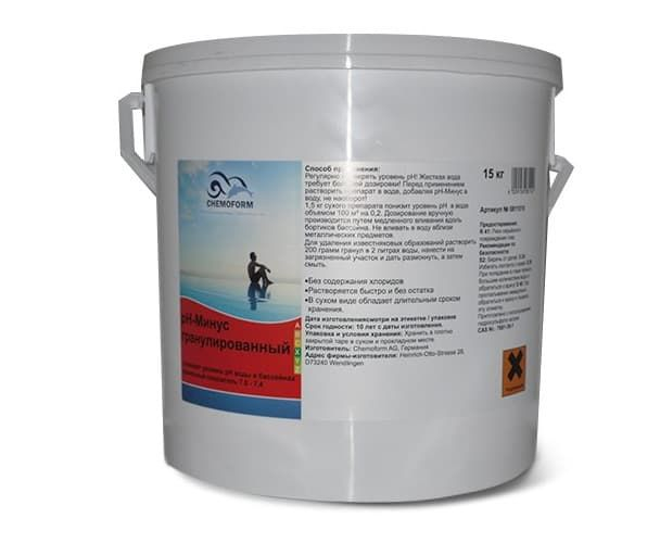 Значение уровня рН в воде рекомендуется проводить тестером 2-3 раза в неделю. Если показания выше 7.6 то необходимо снизить его до рекомендуемых, добавив Chemoform рН - минус. Для понижения уровня рН на 0.2 единицы, необходимо использовать 150 грамм средства на 10 кубических метров воды. Не рекомендуется использовать в местах расположения фильтров.